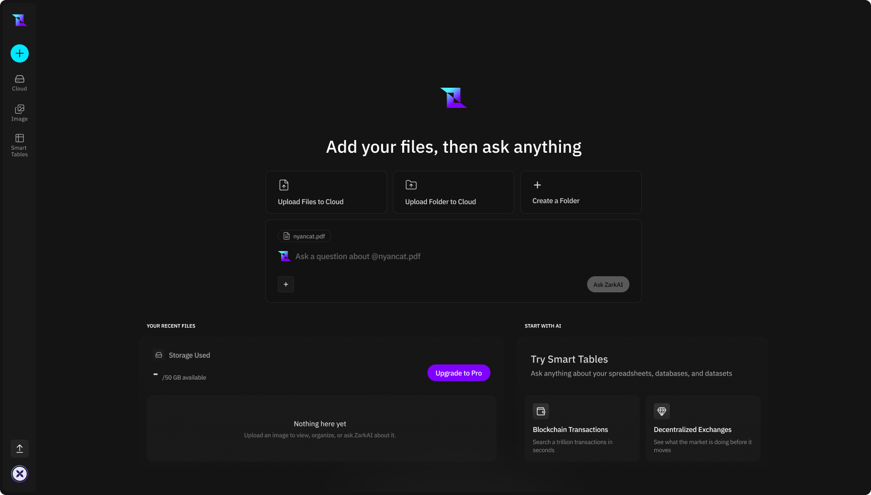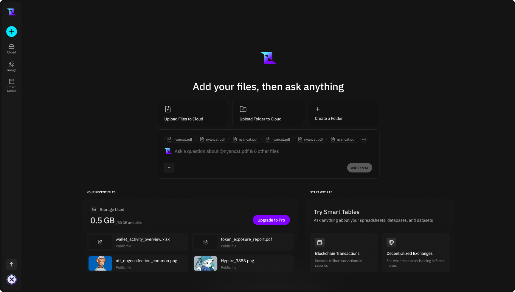You can upload files to Zark Drive through the interface using either drag-and-drop or the file picker. Multiple files can be uploaded at once, and supported formats are processed automatically based on file type.